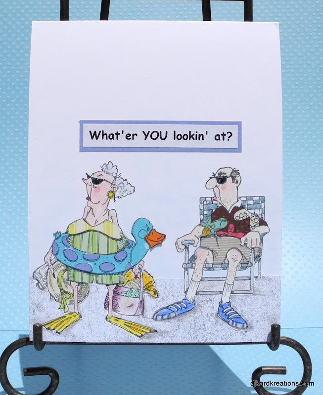This card represents the time me and the Mister were on a cross-county jaunt to see the Only Son Who Moved Far Away.  Because it was a long jaunt, it necessitated a couple of overnight stays in inexpensive motels.  The night we stayed in Moab, Utah, it was horribly hot.  Since our motel didn't have a pool, we walked across the street to use the one at the Hoity-Toity Inn.  We were quite shocked and hurt to find we didn't meet their recidulous dress code standards.  I'm sorry now that the police had to be called, but at the time it seemed we had a principle to stand on.  We gave up when they showed us the above picture from their security video.